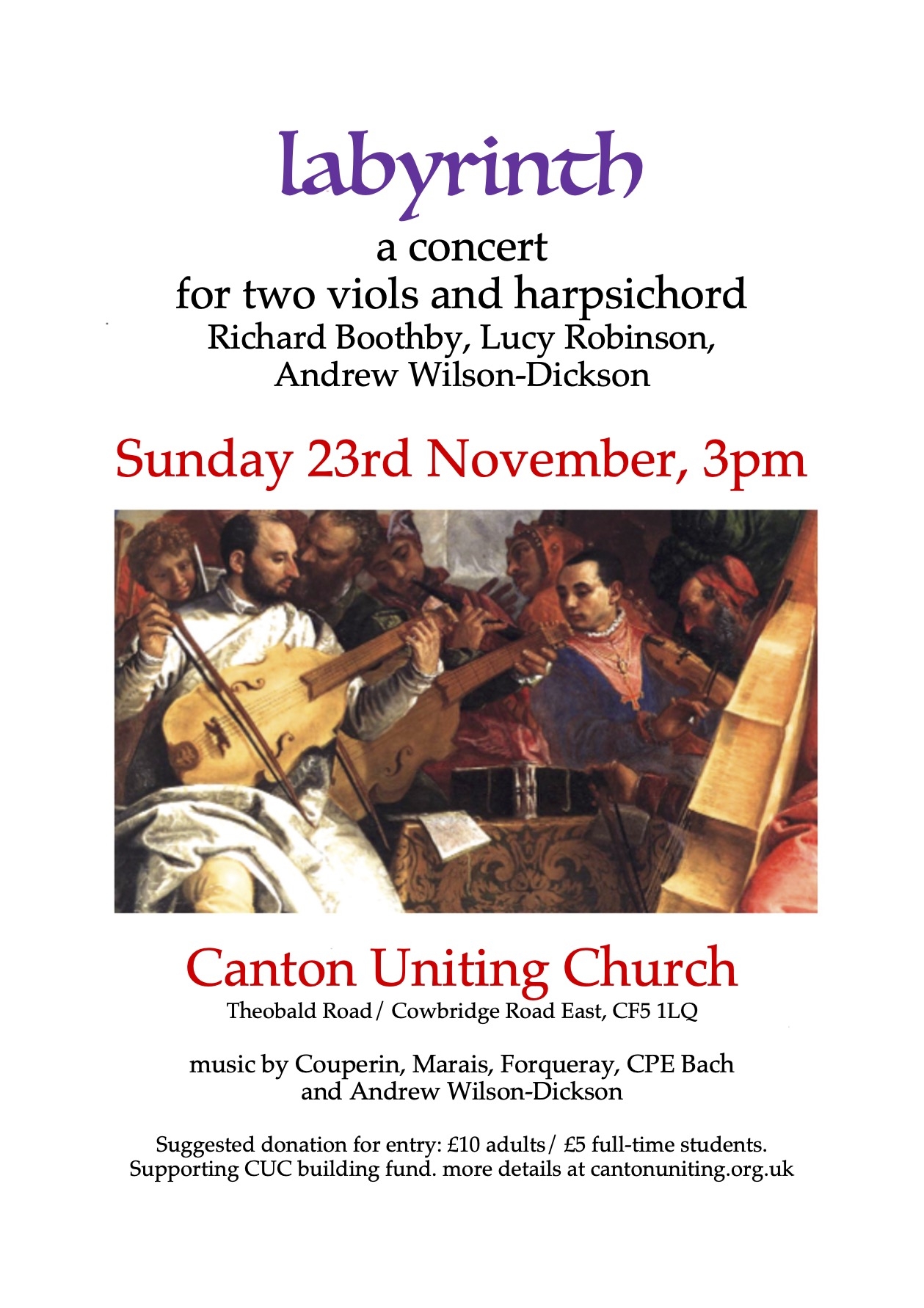 *November 23rd* Sunday 3pm 'Labyrinth' - Richard Boothby, Lucy Robinson (viols), Andrew Wilson-Dickson (harpsichord). Suggested donation for entry: £10 adults/ £5 full-time students. Supporting CUC building fund.