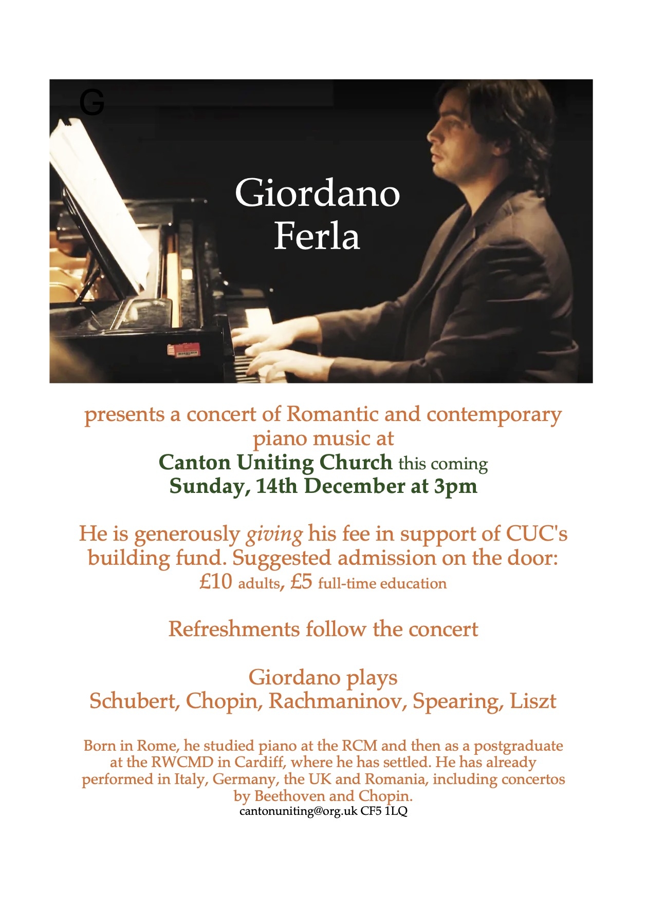 international prizewinning pianist Giordano Ferla. 'From Romantic to Contemporary' Suggested donation for entry: £10 adults/ £5 full-time students. Supporting CUC building fund.