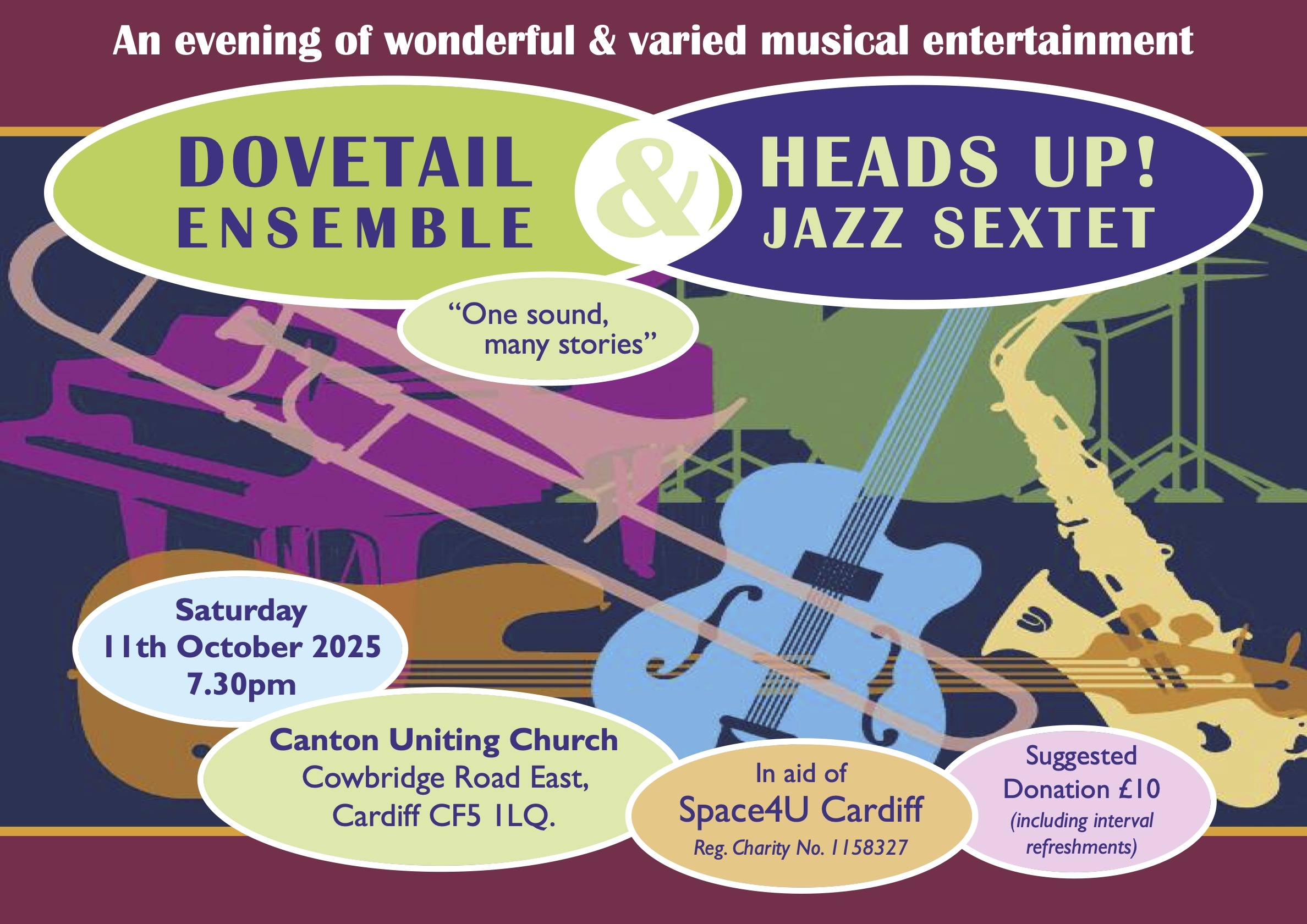 *October 11th* Saturday 7-30pm Dovetail Orchestra and Heads Up! Jazz Sextet Suggested entrance £10. Supporting Space4U.